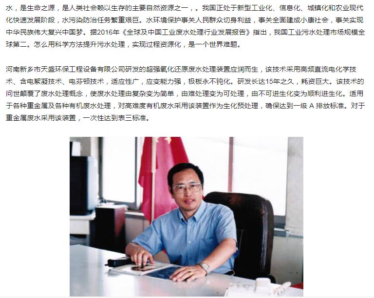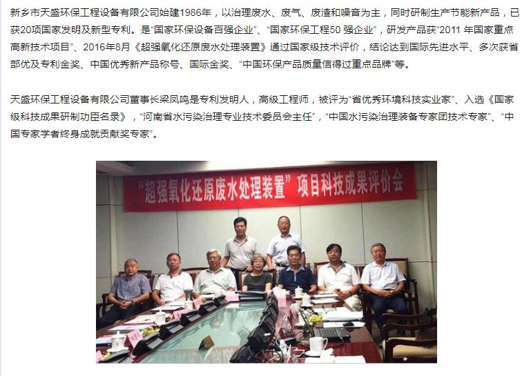 中國高新技術網發(fā)布:《關注:解碼科技創(chuàng)新》——新鄉(xiāng)市天盛環(huán)保“超強氧化還原廢水處理技術”